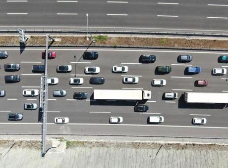 Zaman zaman trafiğin durma noktalarına geldiği uzun araç trafiği havadan görüntülendi.